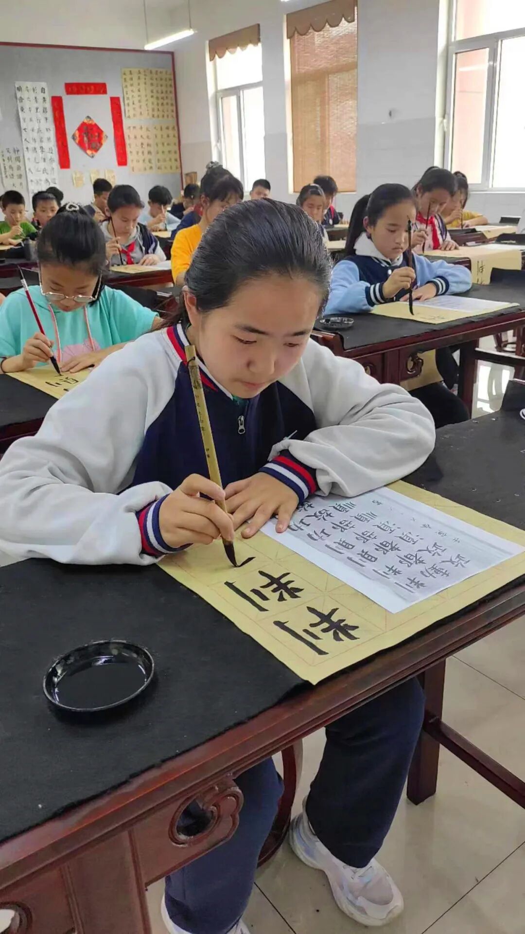 赛场上,同学们坐姿端正,握笔正确,用心书写每一个笔画,横竖撇捺皆有神。所写作品笔画流畅、横平竖直、结构匀称、整体美观,展现出我校学子良好的书写习惯。