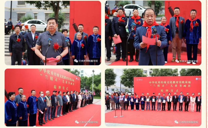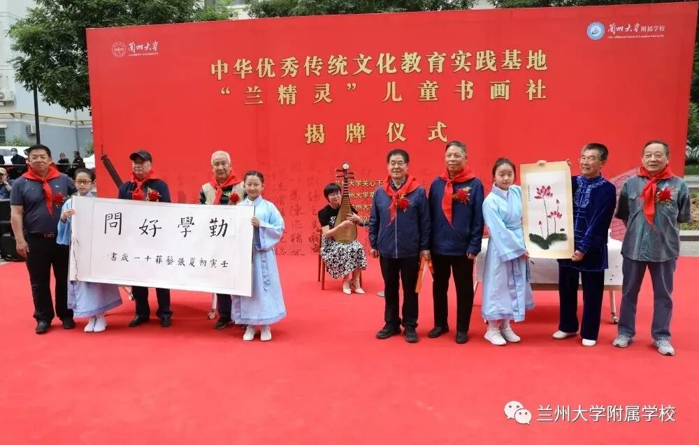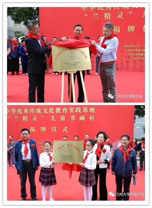 近日,兰州大学附属学校在兰大各级领导的亲切关怀下,在兰州大学关心下一代工作委员会的大力支持下,中华优秀传统文化教育实践基地、兰精灵儿童书画社揭牌仪式在兰州大学一分部顺利举行。兰州大学党委常务副书记、关工委主任吴国生,兰州大学原党委副书记、关工委常务副主任李恒滨,甘肃省书法家协会主席安文丽,甘肃省老教授协会会长、关工委副主任杨克虎,甘肃省关工委办公室主任郭万春,兰州大学萃英书画协会会长秦理斌,兰州大学第一医院原党委书记贾宝全,兰州大学萃英书画协会老专家老教师,兰州大学关心下一代工作委员会各成员单位领导,兰州大学附属学校师生代表参与揭牌仪式。仪式由兰州大学关工委副主任、兰州大学离退休处处长宋德明主持。